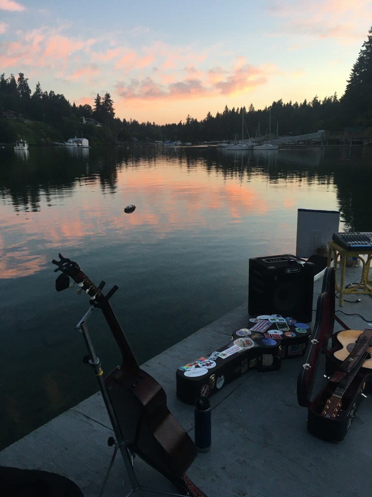 We play music here sometimes, perched carefully upon a float fastened to a bulkhead or set at the end of a long dock, upon the Salish Sea. Real estate is always limited for us three and all our gear, but the view is worth every moment.
