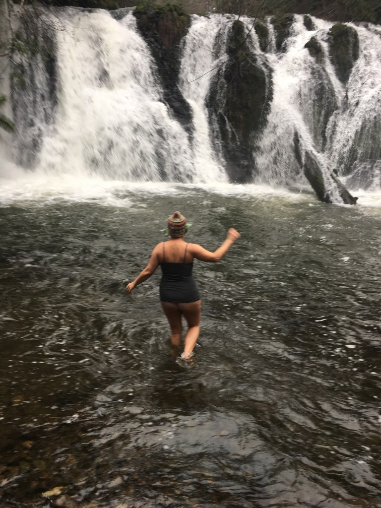 My husband and son giggled today as I loudly talked myself into a swim, over my first cup of coffee, near noon. The pandemic has really wreaked havoc on my sleep schedule—and rational thought. That or peri-menopause. Last Sunday after my first winter waterfall swim I had floated the idea of “getting in every day for the month of February”, as a fundraiser for the local food bank. Well, that didn’t happen.